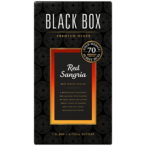 Black Box Red Sangria is a refreshingly delicious wine that comes in a sleek, portable box. This box wine has notes of fresh berry and citrus with hints of orange zest leading to a crisp, just sweet enough finish. Sangria is best enjoyed chilled in a wine glass or over ice with slices of your favorite fresh fruit. This red wine pairs delightfully with foods like spicy meats or grilled seafood. Black Box Red Sangria is great for a variety of occasions, whether you're entertaining friends and family at an outdoor barbecue or when you are unwinding after a long day of work. Each 3 L box contains about 4 bottles of wine with 10% alcohol by volume. The convenient box is shatterproof and resealable, making any outing easy. Plus, the wine stays fresh for up to 6 weeks after opening, giving you plenty of time to enjoy it. Made from grapes harvested in world-class appellations, Black Box is the most awarded boxed wine. In addition to Red Sangria, Black Box also offers Cabernet Sauvignon, Pinot Noir, Merlot and other varieties.